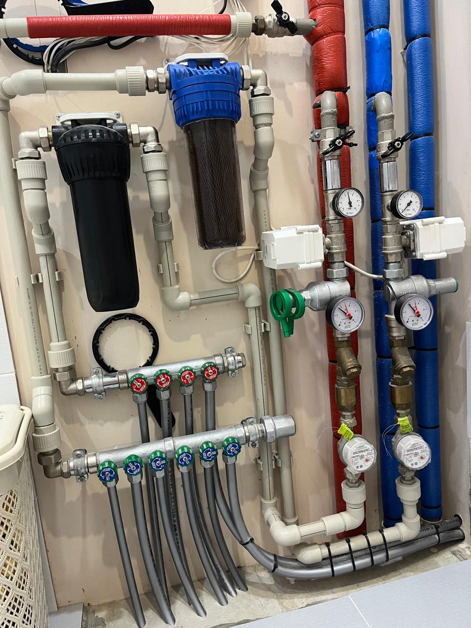 - Система водоснабжения по коллекторной схеме обеспечивает стабильное давление воды, позволяя легко отключать контуры для ремонта без ущерба для других.